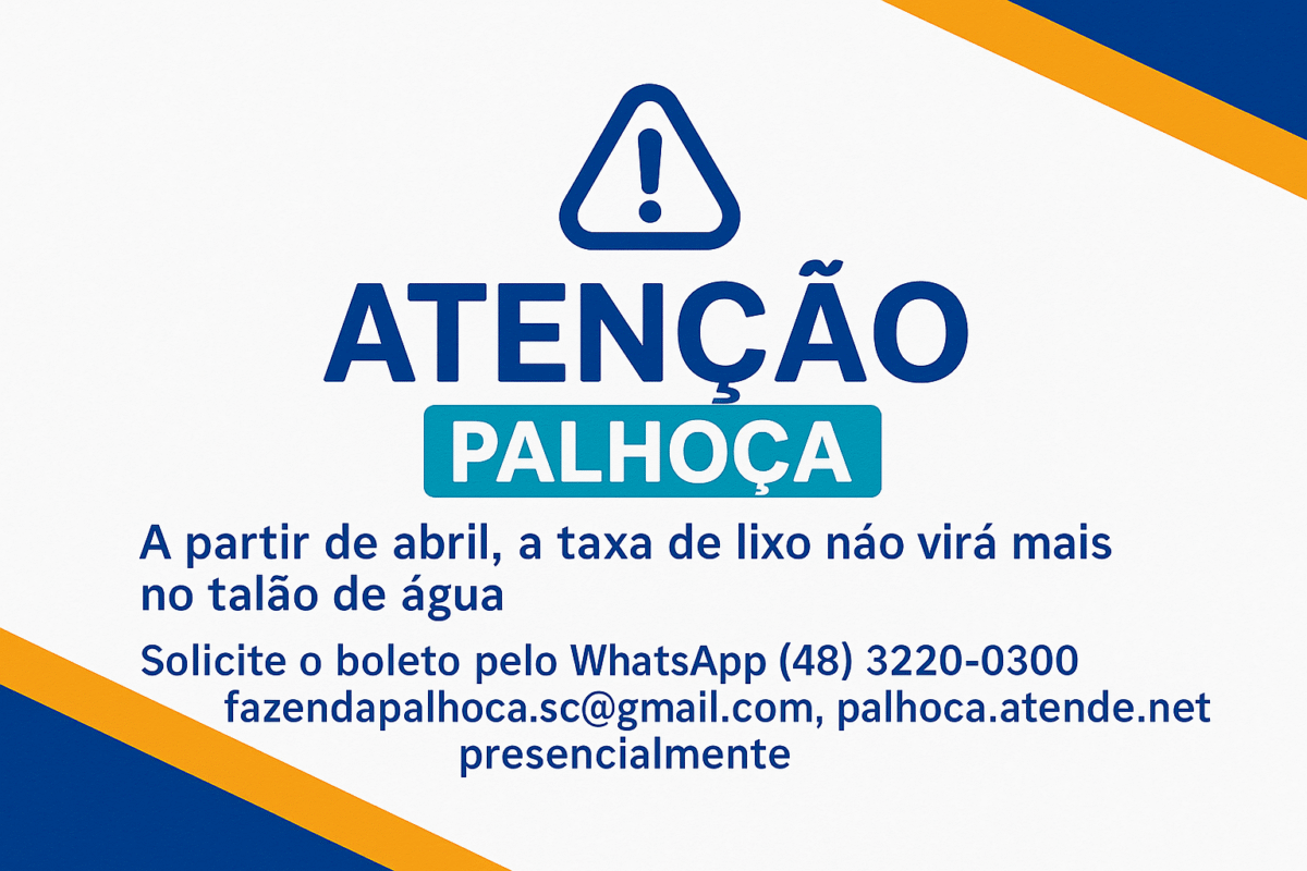 A Prefeitura de Palhoça informa que, a partir de abril, a taxa de lixo não será mais incluída no talão de água. A alteração acontece po...